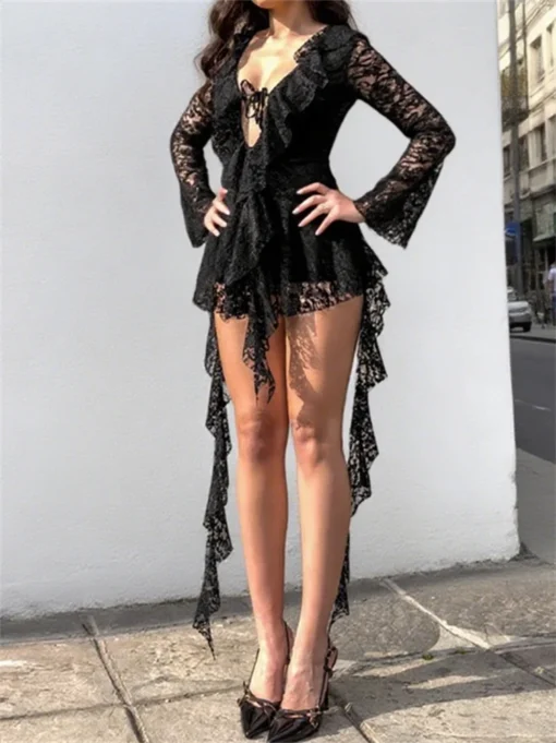Women Summer Fall Dress Long Sleeve Flounce V Neck Tie-up Mini Dress Party Club Beach Sexy Y2K Dresses