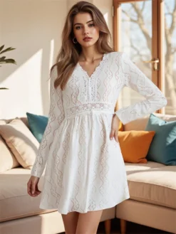 Women Eyelet White Dress Long Sleeve Deep V Neck Lace Patchwork Dress Autumn Casual Bohemian